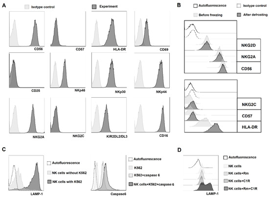 K562 cells obtained from the American Type Culture Collection (ATCC, Manassas, VA, USA) and modified K562-mbIL21 cells also expressing CD64, CD86, CD137L (4-1BBL), and truncated CD19 produced earlier [18] were cultivated using a complete RPMI-1640 medium, i.e., RPMI-1640 supplemented with 10% fetal calf serum (FCS) (HyClone, Logan, UT, USA), 2 mM of L-glutamine (PanEco, Moscow, RF), and an antibiotic-antimycotic solution (Millipore-Sigma, St. Louis, MO, USA), at the concentration of 2–6 × 105 cells/mL. Before using for NK cell stimulation, K562-mbIL21 cells were irradiated with γ-radiation (100 Gy) and immediately frozen in FCS containing 10% DMSO (Sigma-Aldrich, St. Louis, MO, USA) and stored at −135 or −150 °C. The C1R cell line was obtained from ATCC and cultivated using a complete RPMI-1640 medium at the concentration of 2–6 × 105 cells/mL.