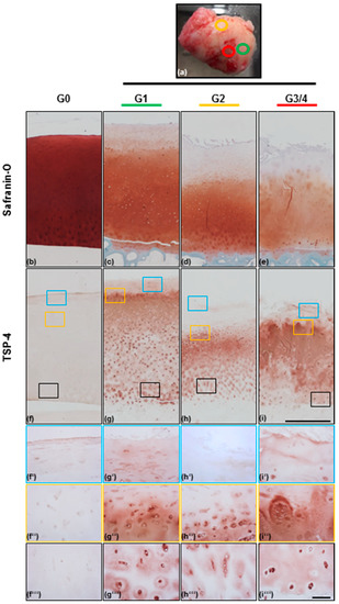 Histological staining of articular cartilage with Safranin-O was performed to demonstrate the presence and localization of proteoglycans (PGs). According to the literature, PGs were intensely and homogenously stained in non-OA (grade 0; G0) cartilage and started to be continuously degraded from G1 to G3/4 OA cartilage (Figure 1b–e). This overview staining of PGs was also used to confirm the first classification of the samples that was done by visually grading the morphological appearance of femoral condyles. In G3/4 cartilage the superficial and upper zone is already degraded and cell clusters were seen (Figure 1i’’). For the detection of TSP-4, we used a specific antibody raised in rabbits and directed against the recombinant full-length protein. TSP-4 was almost undetectable in healthy cartilage, with only a very weak staining in the superficial zone (blue boxes). All OA tissues were obviously more intensely stained than the healthy cartilage. In all severity grades, the most intense TSP-4 staining was seen in the transition zone (yellow boxes) in which PGs were still present but degradation was already initiated. The stained area expands with severity grade and the borders become blurred. TSP-4 was present in all areas of the ECM in the transition zone and it seems as if there was an intracellular staining. Compared to the transition zone, the interterritorial staining became weaker in deeper cartilage layers (black boxes). Further, a stronger pericellular and intracellular localization was seen. The overall staining intensity seems to increase with severity (Figure 1f–i). In addition, minor differences in the protein localization depending on severity could be detected (Figure 1f’–i’’’). In the deep zone, there is an increased signal in the interterritorial matrix in G3/4 as compared to G1 and G2 (Figure 1f’’’–i’’’).