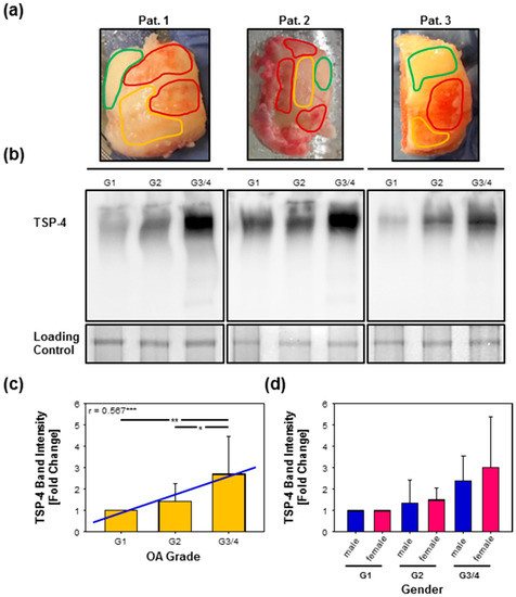 Detection of TSP-4 in total protein extracts from OA knee articular cartilage. (a) Knee condyles from three OA patients with marked areas, from which the proteins were isolated (green = grade 1 [G1], orange = grade 2 [G2], red = grade 3/4 [G3/4]). (b) Proteins extracted from areas of different OA severity grades were analyzed via immunoblot to detect TSP-4. Equal loading was demonstrated via PageBlueTM staining (loading control). (c) Statistical analysis of the immunoblots revealed an increase of TSP-4 with OA severity grade. The amount of TSP-4 correlated positively with OA severity (r = 0.567, ***, blue line). (d) No difference in TSP-4 levels between male and female OA patients was found at any severity grade. Immunoblots were shown as representative data from different donors. Values are represented as means ± SD and significance (p < 0.05 *; p ≤ 0.01 **; p < 0.001 ***) was analyzed by Friedman test with Tukey post hoc analysis or Mann–Whitney U test as well as the correlation with the Spearman rank test. Pat. = patient; OA = osteoarthritis.