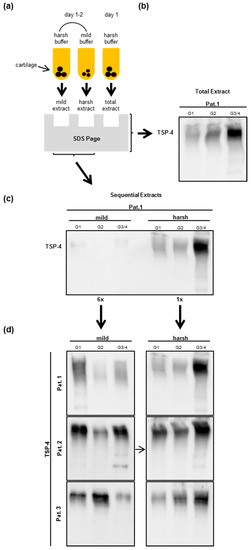 Detection of TSP-4 in extracts after sequential protein extraction from OA knee articular cartilage. (a) Schematic overview of the sequential protein extraction procedure. On the first day, proteins were extracted overnight with a mild buffer and supernatants were collected on the following day. Remaining cartilage pieces were resuspended in a harsh buffer to extract still-anchored proteins. To extract total proteins, only the harsh buffer was added and the total protein extract collected. Total (b), weakly, and tightly anchored TSP-4 (c) level in OA patients were analyzed via immunoblot. When equal protein amounts were loaded, the weakly anchored proteins were hardly detectable. Therefore, a six-fold amount of this extract was loaded to be able to detect differences between OA severity grades and to compare the extraction behavior with that of tightly anchored proteins (d). Immunoblots were shown as representative data from different donors. OA severity grades: grade 1 (G1), grade 2 (G2), and grade 3/4 (G3/4). Pat. = patient.