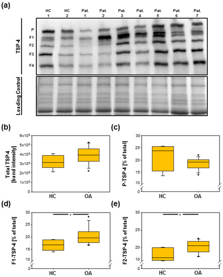 To analyze TSP-4 levels in serum of healthy controls (HCs) and OA patients, we performed immunoblots. We found that pentameric TSP-4 as well as fragments of TSP-4 were present in the sera of both HCs and OA patients (Figure 5a). We did not detect significant differences in the amount of total (p = 0.151) (Figure 5b) and pentameric (p = 0.375) (Figure 5c) TSP-4, even though there might be a tendency for the amount of the pentamer to be slightly increased in HCs compared to patients. However, amounts of fragment 1 (p = 0.03 *) (Figure 5d) as well as of fragment 2 (p = 0.023 *) (Figure 5e) were significantly increased in OA patients. The levels of fragment 3 (p = 0.844) and fragment 4 (p = 0.139) were not altered in OA.