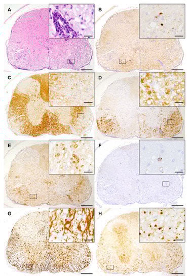 - Herder, V.; Iskandar, C.D.; Kegler, K.; Hansmann, F.; Elmarabet, S.A.; Khan, M.A.; Kalkuhl, A.; Deschl, U.; Baumgärtner, W.; Ulrich, R.; et al. Dynamic Changes of Microglia/Macrophage M1 and M2 Polarization in Theiler’s Murine Encephalomyelitis. Brain Pathol. 2015, 25, 712–723. [Google Scholar] [CrossRef] [PubMed]