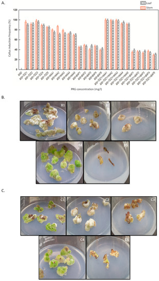 Callus was initiated after 10–12 days of culturing explants. In case of leaf explants, TDZ (1.0 mg/L, 2.0 mg/L and 3.0 mg/L) and 1.0 mg/L TDZ + NAA (1.0 mg/L, 2.0 mg/L and 3.0 mg/L) led to highest callus induction (95–100%) as compared to BAP alone or combination of BAP with TDZ. NAA alone resulted in around 80% callus induction, but the value greatly increased (up to 90%) when TDZ was used in combination. Similarly, the induction frequency for stem explants was close to 100% when TDZ was employed either alone or combined with NAA (Figure 1A). However, higher concentration of all the tested PGRs restricted callus induction in both stem and leaf explants, possibly due to repression of some endogenic PGRs retarding callus formation. Indeed, changes in callus response formation have already been ascribed to diverse endogenous hormonal responses pointing to the variable sensitivity of tissues toward these PGRs. Sreedevi et al. (2013) and Anjum et al. (2017) reported similar observations [31,32]. No callogenesis was observed on MS medium lacking these PGRs, which has already been observed for various other plant species such as Stevia rebaudiana [33].