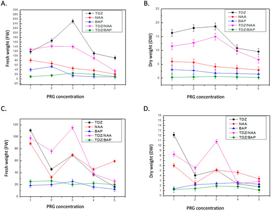 Murthy et al. (1998) estimated that TDZ is a potent PGR for in vitro culture successive growth [36]. TDZ at a concentration of 3.0 mg/L produced highest biomass (FW 250.65 g/L and DW 18.65 g/L) in stem-induced callus cultures (Figure 2A,B). Similarly, 1.0 mg/L TDZ + 3.0 mg/L NAA resulted in FW of 140.22 g/L and DW of 14.98 g/L. Conversely, application of BAP alone or in combination with TDZ showed least response for biomass accumulation (Figure 2A,B). As for NAA, maximum biomass (FW 80.79 g/L and DW 5.98 g/L) was observed at 1.0 mg/L concentration, which then gradually decreased with increase in the concentration of NAA, as shown in Figure 2A,B. In case of leaf-derived callus cultures, optimum biomass accumulation (FW 115.2 g/L and DW 10.81 g/L) was observed for 1.0 mg/L TDZ + 3.0 mg/L NAA (Figure 2C,D). However, BAP + TDZ resulted in minimum biomass accumulation (Figure 2C,D).