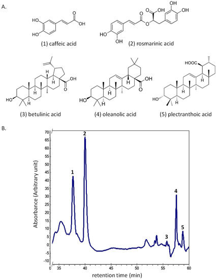 The contents of caffeic acid, rosmarinic acid, oleanolic acid, plectranthoic acid and butelinic acid were determined by HPLC. Following a published protocol, a reversed-phase HPLC equipped with autosampler, Varian (Les Ulis, France) Prostar 230 pump and a Varian Prostar 335 photodiode array detector was used and controlled with Galaxie software (Varian v1.9.3.2) [19]. Briefly, the separation was achieved on an RP-18 column (5 μm, 250 × 4.0 mm id (Purospher Merck, Fontenay sous Bois, France)) at 35 °C. The mobile phase was comprised of acetonitrile (as solvent A) and 0.1% (v/v) formic acid acidified ultrapure water (as solvent B). The composition of the mobile phase varied during a 60 min run according to a linear gradient ranging from a 5:95 (v/v) to 100:0 (v/v) mixture of solvents A and B, respectively, at a flow rate of 0.6 mL/min. Detection was accomplished at 210 nm and 254 nm. Quantification and identification of each compound was done by coupling with retention times, UV spectra to those of authentic reference standards and by standard additions. Calibration curve (six points) was used to quantify each standard with the range of 0.05–1 mg/mL and correlation coefficient of at least 0.9994.