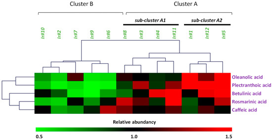 Hierarchical clustering analysis (HCA) was applied first to discriminate the different sample extracts based on their qualitative and quantitative phytochemical profiles (Figure 5). Regarding this HCA, decomposition into two main groups was observed. The first cluster (i.e., cluster A on Figure 5) grouped together sample extracts with the highest phytochemical accumulation capacities, with the sub-cluster A1 rich in pentacyclic triterpenes (BA, PA, and OA) and the sub-cluster A2 accumulating highest amount of phenolic acids (RA and CA). In contrast, cluster B shows sample extracts with the lowest accumulation capacities of these compounds. While we previously observed that stem-derived callus was generally more attractive than leaf-derived callus when considering each hormonal treatment individually, here the HCA pointed that the hormonal treatment is a prominent parameter over explant origin for an optimal accumulation since both stem and leaf-derived callus sample extracts were distributed equally in both clusters. Combination of NAA with higher concentrations of TDZ (Ir#11 and Ir#12) appeared to be the most favorable hormonal balances for accumulation of both pentacyclic triterpene and phenolic acid compounds in I. rugosus in vitro cultures.