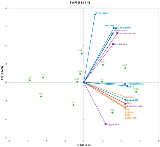 In order to rationale the apparent complex linkage between phytochemicals and biological activities, a principal component analysis (PCA) was then conducted (Figure 6). The obtained separation was satisfactory and allowed explaining 88.28% of the apparent complexity (F1×F2, Figure 6). The discrimination mainly occurred through the first dimension (F1 axis), explaining 70.13% of the apparent complexity by itself and allowing the separation of the sample extracts according to their phytochemical composition and biological activities. This point is of particular interest since it clearly evidences that it is possible to predict the antioxidant and anti-aging potential of a sample extract based on its phytochemical profile and that a direct linkage could exist between these two parameters. The second dimension axis (F2) accounted for only 18.14% of the initial variability, but intriguingly, it allowed the discrimination between: 1) Sample extracts rich in pentacyclic triterpenes and showing high inhibition capacities of tyrosinase, elastase and collagenase, and 2) sample extracts rich in phenolic acids showing the highest antioxidant activities, anti-AGEs, hyaluronidase inhibition, and SIRT1 activation. From this analysis, it appeared that sample extracts Ir#8 and Ir#11 were the most attractive for cosmetic applications looking for natural antioxidants, anti-hyaluronidase, anti-AGEs, and/or activator of SIRT1, whereas sample extracts Ir#1, Ir#2, and Ir#5 were the most promising for a natural anti-tyrosinase, anti-elastase, and/or anti-collagenase applications. Note that sample extracts Ir#3 appeared as the most potent extract for these cosmetic applications targeting the whole set of these activities.