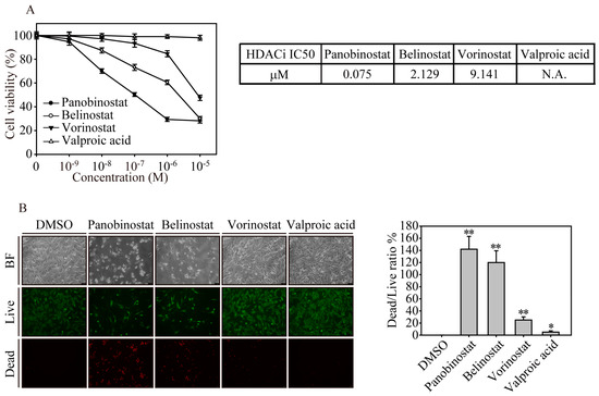 Squamous-cell thyroid carcinoma (STC) cells were treated with different concentrations of four FDA-approved clinical HDACi drugs (panobinostat, belinostat, vorinostat and valproic acid) for the cell viability assay (Figure 1A). After HDACi drug exposure for 24 h, cells treated with panobinostat had a relatively low cell viability at 0.1 µM (50%) compared to belinostat (73.1%), vorinostat (93.3%) and valproic acid (99%) treatments. In addition, by investigating different doses of panobinostat treatment, SW579 cells had a lower cell viability at 1 and 10 µM (29.4% and 28.2%, respectively), whereas belinostat and vorinostat reached the maximum anticancer effect at 10 µM (30% and 47.5%, respectively) treatments. After analysis of the IC50, we observed that the IC50 of panobinostat is 0.075 µM, whereas belinostat and vorinostat have IC50 drug concentrations of 2.129 and 9.141 µM, respectively. Using a live/dead cell assay (Figure 1B), it is clear that exposure to 1 µM panobinostat and belinostat for 24 h caused significant cell death effects (red), with 142% and 120% dead/live cell ratios (p < 0.01), respectively, whereas vorinostat and valproic acid had relatively minor effects on cell death in SW579 cells. These cell viability results clearly indicate that panobinostat is one of the most effective anticancer drugs among the HDACi drugs on squamous-cell thyroid carcinoma of advanced thyroid cancer.
