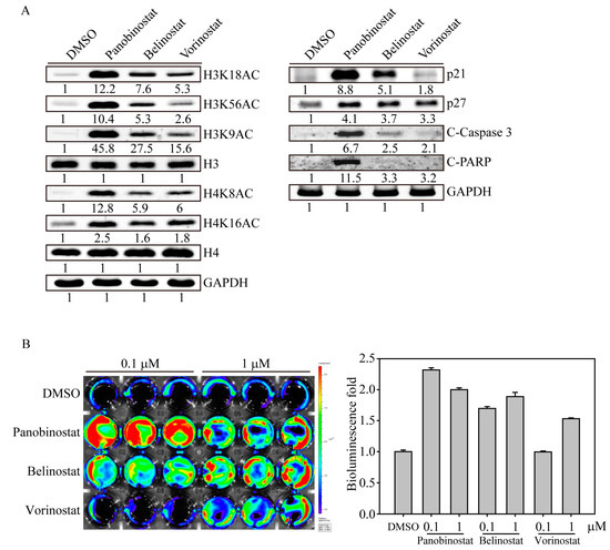 Next, we investigated the acetylation sites of the histone complex that are activated by HDACi drugs in SW579 cells (Figure 2A). According to the cell viability results, we excluded valproic acid in the following investigations due to its minor effect on SW579 cells. After 6 h of HDACi treatment, panobinostat significantly induced histone H3 acetylation at amino acids 9, 18 and 56, whereas histone H4 was acetylated at sites 8 and 16. In contrast, belinostat was the second most effective drug that induced H3 and H4 histone acetylation in SW579 cells compared to vorinostat treatment. Furthermore, we also observed that panobinostat is the only drug that significantly induced p21 protein expression and activated cell apoptosis-related proteins, such as caspase and PARP (C-caspase and C-PARP), in SW579 cells, whereas GAPDH protein expression remained unchanged.