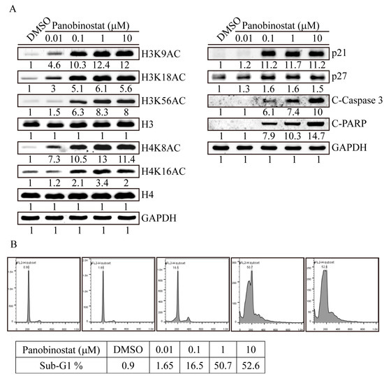 Panobinostat dose-dependently induced histone acetylation and apoptosis-related protein expression in SW579 cells. (A) Cell lysates from SW579 cells treated with different concentrations (0.01 to 10 µM) of panobinostat for 6 h were immunoblotted with different H3 (H3K9AC, H3K18AC and H3K56AC) and H4 (H4K8AC and H4K16AC) histone acetylation antibodies. Cell lysates of SW579 cells treated with panobinostat for 24 h were analyzed for cell cycle (p21 and p27) and apoptotic-related (C-caspase 3: cleaved caspase 3 and C-PARP: cleaved PARP) protein expression. The H3, H4 and GAPDH immunoblots served as internal controls. Densitometric analysis of all western-blot was performed by ImageJ software. The protein expressions were normalized with their internal control such as H3, H4 or GAPDH expressions and shown as fold of control. (B) Cell cycle analysis of dose-dependent panobinostat treatments from 0.01 to 10 μM on SW579 cells by flow cytometry. Apoptotic cells were determined by the sub-G1 cell population.