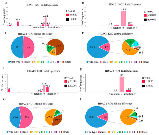 Genomic DNA was extracted and PCR was used to amplify the HDAC1 and HDAC2 gene region using exon 2 DNA primers, which are listed in Supplementary Table 2, whereas sgRNA sequence were underlined. The PCR products were purified using a PCR clean-up purification kit and were sequenced by the Sanger method using forward PCR primers. The editing efficiency of the sgRNAs and the potential induced mutations were assessed using Tracking of Indels by Decomposition (TIDE) software (https://tide-calculator.nki.nl; Netherlands Cancer Institute, Amsterdam, The Netherlands), which only required two Sanger sequencing runs from wild-type and mutated cells.