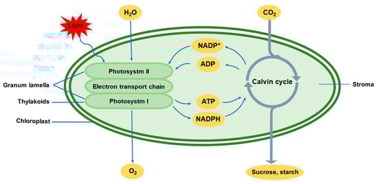 Photosynthesis is a complex, multi-step process comprising many biological pathways. The photoelectron transport system and the Calvin cycle are two important steps in photosynthesis that involve the conversion of light energy into adenosine triphosphate (ATP) and nicotinamide adenine dinucleotide phosphate (NADPH) and the fixation of CO2 into carbohydrates. These two processes are controlled by many genes/gene products encoded by the chloroplastic and nuclear genomes [5,6]. The expression of genes related to photosynthesis in the chloroplast and nucleus is highly variable. The gene products work together in an extensively coordinated photosynthesis network composed of genes, regulatory components, signaling factors and metabolic processes and are affected by various environmental factors [7]. Abiotic stresses such as drought, salinity, flooding, high light, high temperature and cold can restrict the process of photosynthetic carbon metabolism in plants and can adversely affect plant growth and productivity. In agriculture, various abiotic stresses have become the main limiting factors for crop production. Abiotic stresses are ultimately defined as those that impact crop yields, i.e., the final economic output [8]. One of the non-negligible abiotic conditions is temperature stress, which is the main environmental factor that affects the duration of a plant’s growing season as well as its biogeographical distribution [9], limiting crop yields.