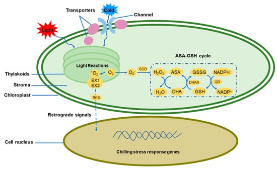 ), and singlet oxygen (1O2) are generated due to the highly oxidizing metabolic activity of these compounds and increased electron flow rate [51]. The ROS in plants are in a dynamic equilibrium under optimal conditions and cannot severely damage plants. However, under stressful conditions, with the reduction in the ability of plants to utilize light energy, excessive harvested light energy is converted to ROS, thereby affecting the physiological and biochemical functions of plants [52]. However, plants have developed many strategies to cope with the overaccumulation of ROS and maintain normal photosynthetic efficiency. These processes involve complicated redox reaction chains and ROS-scavenging systems.When the environmental temperature is substantially lower than the temperature for normal growth, the light and dark reactions of photosynthesis can be unbalanced, resulting in excess electrons within the transport chain. The photosynthetic electron transport chain transfers excess electrons to O2 as an alternative electron acceptor to release more O2−. For example, low temperature can cause an increase in O2− in bermudagrass cells [53]. On the one hand, excess ROS are toxic to aerobic plants and can cause peroxidation of the chloroplast bio-membrane system and disrupt its function. Similarly, bio-membrane-anchored functional proteins can also be attacked by ROS. Moreover, continuous chilling stress disrupts the integrity of the bio-membrane and eventually leads to the loss of membrane system activity [54]. On the other hand, excess ROS promote the enhancement of the antioxidant system in plants, further reducing the damage caused by ROS to plants. However, aside from the toxicity of ROS indicated above, they are considered secondary messengers and play roles in regulating plant growth, development, and stress responses [55,56,57,58,59,60,61]. As stress signals, ROS can regulate gene expression in both the chloroplasts and nucleus, thereby regenerating damaged proteins, restoring lipid homeostasis and promoting plant adaptation to low temperature. ROS signaling may also regulate the expression of antioxidant-related genes by activating mitogen-activated protein kinase (MAPK) cascades [56].
