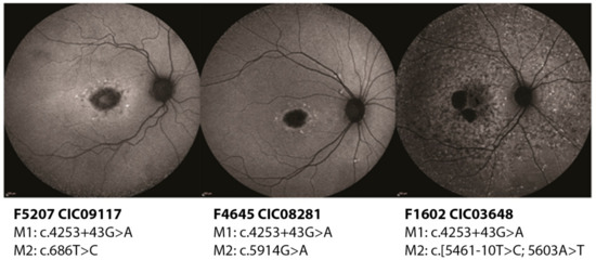 - Lee, W.; Xie, Y.; Zernant, J.; Yuan, B.; Bearelly, S.; Tsang, S.H.; Lupski, J.R.; Allikmets, R. Complex inheritance of ABCA4 disease: Four mutations in a family with multiple macular phenotypes. Hum. Genet. 2016, 135, 9–19. [Google Scholar] [CrossRef]