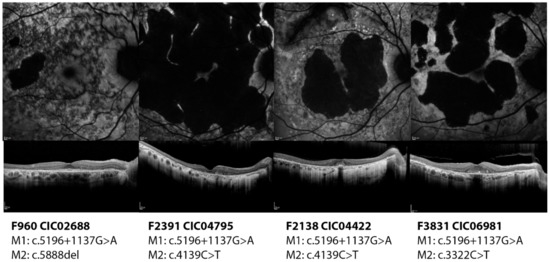 Subjects CIC02688, CIC10544, CIC04795, CIC06981, CIC07459, and CIC04422 harbor the variant c.5196+1137G>A on intron 36 (pedigrees shown in Figure S5). With the exception of CIC07459, the other subjects show a later disease onset with foveal sparing, which allows them to preserve a central area of vision with a relatively good visual acuity (Figure 3).