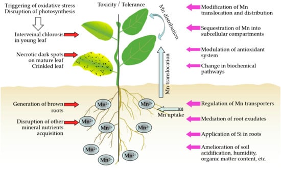 Schematic representation of Mn toxicity and strategies for increasing Mn tolerance in plants. Mn toxicity can trigger oxidative stress and disrupt photosynthesis, which may result in the generation of interveinal chlorosis in young leaves, necrotic dark spots on mature leaves, and crinkled leaf. Furthermore, Mn toxicity can lead to the formation of brown roots and prevent the uptake and translocation of other mineral elements. In plants, Mn tolerance strategies include modification of Mn translocation and distribution, sequestration of Mn into subcellular compartments, modulation of the antioxidant system, changes in biochemical pathways, and regulation of Mn transporters. In addition, the mediation of root exudates, the application of Si in roots, and the amelioration of soil acidification, humidity, and organic matter content also contribute to increase plant Mn tolerance. Red arrows indicate the toxic effects of excess Mn to plants. Purple arrows represent the adaptive strategies of plants to Mn toxicity.