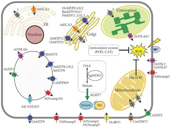 As the amount of Mn accumulated in most plants usually exceeds their normal growth requirements, plants must cope with excess Mn via internal detoxification. In this regard, one of the key strategies for plant tolerance to Mn toxicity is the compartmentalization of Mn into subcellular compartments []. Therefore, transporters that localize to the endomembrane compartments are suggested to be critical for intracellular Mn detoxification in plant cells.