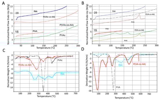 Differential scanning calorimetry (DSC) thermograms of P(VAc-co-AA) and pure components, first and second scan (A); DSC thermograms of P(VA-co-AA) and pure components, first and second scan (B); TGA/DGA traces of P(VAc-co-AA) and pure components (C); TGA/DGA traces of P(VA-co-AA) and pure components (D).