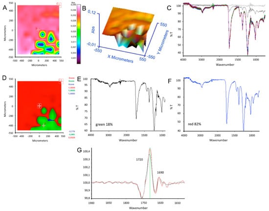 Chemical map in 2D (A), in 3D (B), and corresponding (C) spectra of P(VAc-co-AA) primer after deposition on Ti substrate; PCA analysis map (D) and spectra corresponding to green area (E) and red area (F); derivative spectra acquired in green area (G).