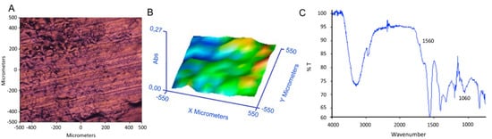 In Figure 3, optical image, 3D chemical map, and reference spectrum of P(VA-co-AA) primer film after deposition on Ti substrate are reported. The results confirm a complete and homogeneous coverage of copolymer on substrate. The spectrum of the copolymer showed the presence of typical absorption bands for PVA and PAA: OH stretching absorption at 3300–3400 cm−1, CH stretching at 2940 cm−1, carboxylic groups stretching at 1720 cm−1, carboxylate groups stretching at 1560 cm−1, and CO stretching at 1262 cm−1 and 1060 cm−1.