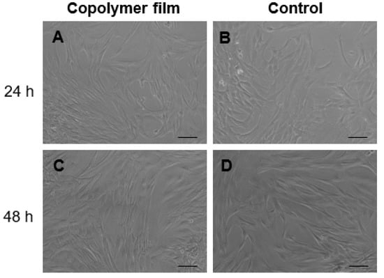 Results of the indirect cytotoxicity assay performed on P(VA-co-AA) copolymer film: micrographs acquired using a light inverted microscope of human dermal fibroblasts (hDFs) (A,C) treated with and (B,D) without conditioned culture medium (CM) for (A,B) 24 h and (C,D) 48 h. Scale bar is 100 µm.