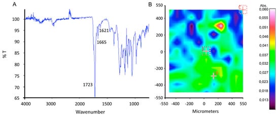 The presence of Dexa into the PBHBV fibers was confirmed by infrared analysis. In Figure 5A, the medium spectrum of PHBHV fibers loaded with Dexa is reported; the most intense frequency at 1723 cm−1 corresponds to carbonyl ester of PHBHV, while the peaks at 1665 cm−1 and 1621 cm−1 were due to the C=O and C=C (in ring) double bond of Dexa. In Figure 5B, the correlation map, with respect to characteristic spectrum of Dexa, confirms the homogenous distribution of the drug at the level of interconnected fiber mesh.
