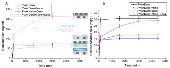 (A) Concentration of Dexa released from different samples versus time; (B) amount of Dexa released with respect to the initial content of the loaded drug for all samples examined.
