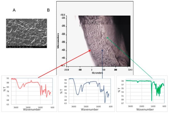(A) SEM image of superior surface of multifunctional coating; (B) FT-IR chemical imaging: optical image of a section of three-layered coating (after forced detachment from a titanium substrate), the spectrum to the left of the optical image shows the P(VA-co-AA) bands, the spectrum below shows the PVA bands, and the spectrum to the right of the optical image corresponds to that of PHBHV.