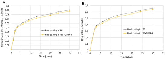 The release test of Dexa from multilayered coating was carried out both in PBS and in PBS with the addition of MMP-9. The trends of Dexa release are reported in Figure 8.