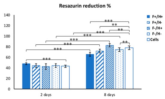 Bar graph showing the metabolic activity (as resazurin reduction percentage, given as average ± standard deviation) of hDFs in contact with the Dexa-loaded and -unloaded fiber/hydrogel composites for 8 days. ** p < 0.001, *** p < 0.0001.