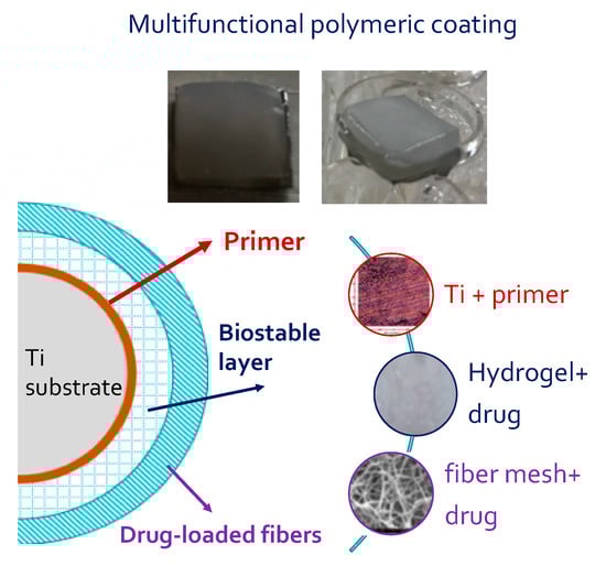 P(VAc-co-AA) was dissolved in THF to prepare a 1% w/v solution and P(VA-co-AA) was dissolved in water to prepare a 0.3% w/v solution. Two layers of 250 µL of P(VAc-co-AA) solution or four layers of 250 µL of P(VA-co-AA) solution were stacked up on the oxidized titanium platelets to act as primer between the metal and the PVA hydrogel. The P(VA-co-AA) primer was cross-linked by dehydro-thermal method in a controlled temperature ramp under vacuum conditions: from RT to 50 °C for 2 h, 90 °C overnight, 120 °C for 3 h, and then cooling to 50 °C. The hydrogel layer was produced by deposition of 250 µL Dexa-PVA solution on the selected type of primer. Dexa-PHBHV fiber mesh (1 cm2 squares) were put over the hydrogel before the freezing and thawing procedure. The photos of the multifunctional coating before and after immersion in incubation medium and a schematic representation of final assembly are reported in Figure 11.