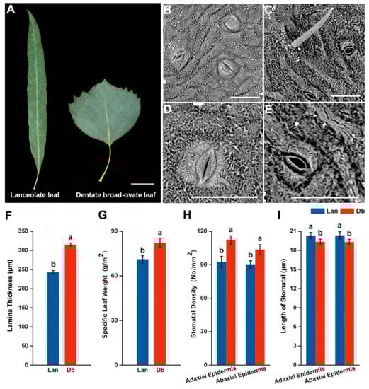 Morphological feature of the two typical heteromorphic leaves distributed at the bottom and top of the canopy of Populus euphratica. (A) The shape of lanceolate and dentate broad-ovate leaves (bar = 2 cm), (B) the epidermis of lanceolate leaf, (C) the epidermis of dentate broad-ovate leaf, (D) the stoma of lanceolate leaf, (E) the stoma of dentate broad-ovate leaf, (F) lamina thickness of lanceolate and dentate broad-ovate leaves, (G) specific leaf weight of lanceolate and dentate broad-ovate leaves, (H) stomatal density of lanceolate and dentate broad-ovate leaves, (I)length of stoma of lanceolate and dentate broad-ovate leaves. The data shown are the mean ± standard deviation; different letters indicate significant difference (p < 0.05) between samples (t-test listed in Table S1); scale bar of electron microscopy images = 50 μm; Lan, lanceolate leaves; Db, dentate broad-ovate leaves.