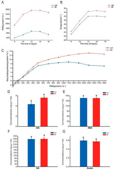 Environmental heterogeneity and phytohormone content of heteromorphic leaves in P. euphratica. (A) Intensity of light radiation on heteromorphic leaves, (B) leaf temperature of heteromorphic leaves, (C) net photosynthesis of heteromorphic leaves respond to different light intensity, (D) IAA content of heteromorphic leaves, (E) ABA content of heteromorphic leaves, (F) GA content of heteromorphic leaves, (G) zeatin content of heteromorphic leaves. Data are presented as mean ± SD; each experiment was performed with more than five replicates; different letters indicate significant difference (p < 0.05) between samples (t-test listed in Table S1); Lan, lanceolate leaves; Db, dentate broad-ovate leaves.