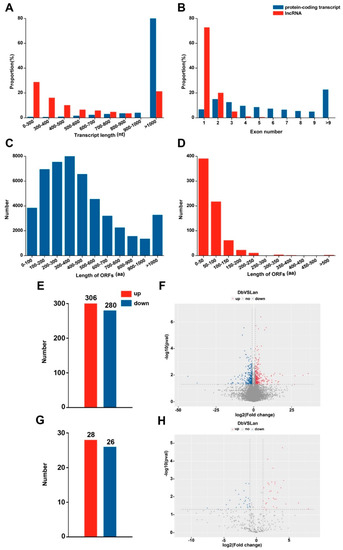Comparisons of properties and differentially expressed mRNAs and lncRNAs between two heteromorphic leaves in P. euphratica. (A) Transcript length distribution of protein-coding transcripts and lncRNAs, (B) exon number of protein-coding transcripts and lncRNAs, (C) statistics of ORF length in protein-coding transcripts, (D) statistics of ORF length in lncRNAs, (E) the number of differentially expressed genes, (F) distribution of differentially expressed genes, (G) the number of differentially expressed lncRNAs, (H) distribution of differentially expressed lncRNAs. ORF, open reading frame; DEG, differentially expressed gene; DEL, differentially expressed lncRNA; Lan, lanceolate leaves; Db, dentate broad-ovate leaves.