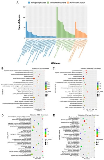 GO and KEGG pathways analysis of differentially expressed genes and target genes between two heteromorphic leaves in P. euphratica. (A) GO annotation of differentially expressed genes between lanceolate and dentate broad-ovate leaves, (B) statistics of GO enrichment of differentially expressed genes, (C) statistics of KEGG pathway enrichment of differentially expressed genes. (D) statistics of GO enrichment of differentially expressed target genes of differentially expressed lncRNAs, (E) statistics of KEGG pathway enrichment of differentially expressed target genes of differentially expressed lncRNAs.