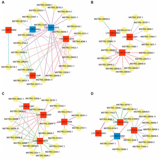 The lncRNAs and target protein-coding gene interactions related to adaption. (A) Interactions associated with light adaption, (B) interactions associated with protein repair, (C) interactions associated with stress response, (D) interactions associated with growth and development. The circular and square nodes represent differentially expressed lncRNAs and differentially expressed target genes, respectively. The red and blue square nodes represent upregulated and downregulated genes, respectively. Details of the interaction relationships among lncRNAs and target protein-coding genes are shown in Additional file 3.