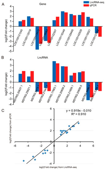 qRT-PCR validation of the candidates from lncRNAs and target protein-coding gene interactions. (A) qRT-PCR validation of 10 selected genes from lncRNAs and target protein-coding gene interactions, (B) qRT-PCR validation of 10 selected lncRNAs from lncRNAs and target protein-coding gene interactions, (C) coefficient analysis for expression fold change of the validation candidates from lncRNA-seq and qRT-PCR.