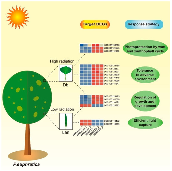 The response to the environmental heterogeneity of heteromorphic leaves in P. euphratica. Data for the gene expression level were normalized to Z-scores. DEGs, differentially expressed genes; Lan, lanceolate leaves; Db, dentate broad-ovate leaves.