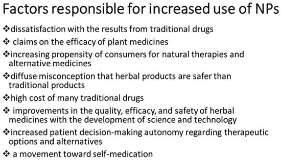 A general belief that NPs are safe exists: Many patients take NPs, presumably based on the assumption that they are effective, safe, and less toxic than traditional drugs [29]. Very often, patients assess NPs as safer than biomedicine on the basis of being “natural”. A factor promoting the consumption of herbal products may be the preconception that botanicals are natural and “natural is good” and consequently safe.