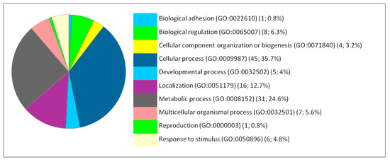 Functional classification of the 127 differentially expressed proteins in the brain following IONP exposure according to the biological processes. The pie chart was generated from PANTHER Classification System. The number and percentage are given based on the 127 proteins. Biological process name (GO: Gene Ontology class ID) (number of proteins; percentage from 127 proteins).