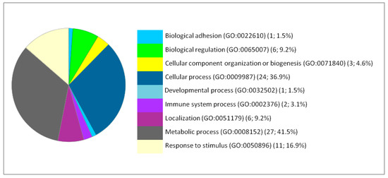 Functional classification of the 66 differentially expressed proteins in the liver following IONP exposure according to the biological processes. The pie chart was generated from PANTHER Classification System. The number and percentage are given based on the 66 proteins. Biological process name (GO: Gene Ontology class ID) (number of proteins; percentage from 66 proteins).