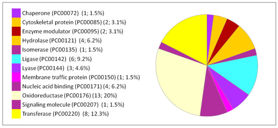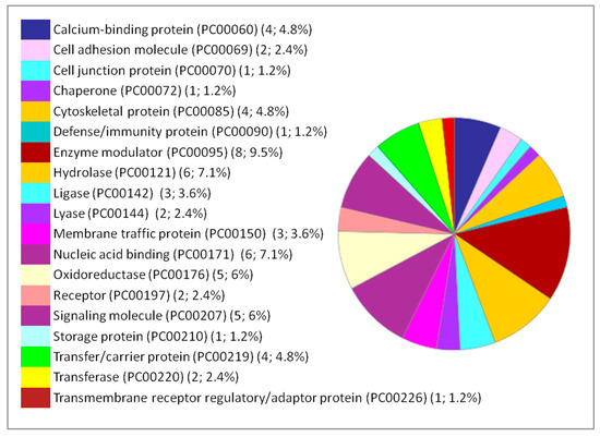 Moreover, the percentages of other processes did not show considerable differences among the three organs studied, such as cellular processes, cellular organization, biological regulation, and response to stimuli. The immunological response is minimal compared to the biological processes mentioned above but it appears only in the liver and lung. Classes of the dysregulated proteins following IONP exposure have been also studied by PANTHER. The results showed diverse classes that are related to the previous mentioned biological processes affected in response to the exposure to the NPs. Common classes were identified between the dysregulated proteins in each of the organs (brain, liver and lung). The results are presented in Figure 4, Figure 5 and Figure 6.