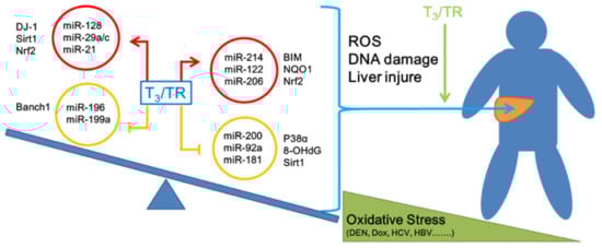 Conversely, an oncogenic role of thyroid hormone in HCC has been reported by other investigators [14,173]. The thyroid hormone is reported to induce oxidative stress through enhancing the expression of different miRNAs in liver, such as miR-128, miR-29a/c, and miR-21, which directly regulate anti-oxidant genes, such as DJ-1, Sirt1, and Bach1, or affect related antioxidant genes, including Nrf2, Keap1, Sirt3, NQO1, and HO-1.