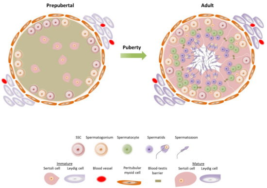 - Sharpe, R.M.; McKinnell, C.; Kivlin, C.; Fisher, J.S. Proliferation and functional maturation of Sertoli cells, and their relevance to disorders of testis function in adulthood. Reproduction 2003, 125, 769–784. [Google Scholar] [CrossRef]