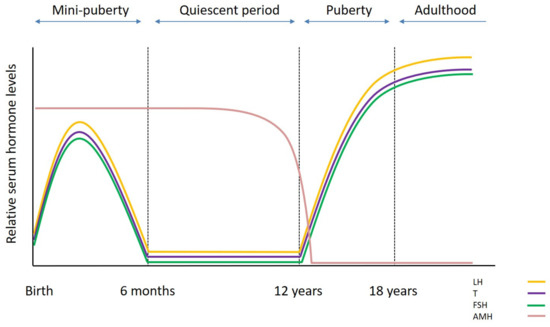 - Rey, R.A. Mini-puberty and true puberty: Differences in testicular function. Ann. Endocrinol. 2014, 75, 58–63. [Google Scholar] [CrossRef]