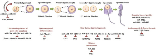 - Smorag, L.; Zheng, Y.; Nolte, J.; Zechner, U.; Engel, W.; Pantakani, D.V.K. MicroRNA signature in various cell types of mouse spermatogenesis: Evidence for stage-specifically expressed miRNA-221, -203 and -34b-5p mediated spermatogenesis regulation. Biol. Cell 2012, 104, 677–692. [Google Scholar] [CrossRef] [PubMed]