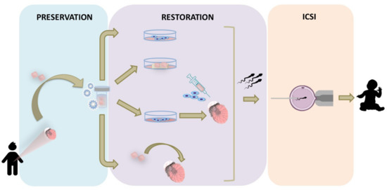 - Picton, H.M.; Wyns, C.; Anderson, R.A.; Goossens, E.; Jahnukainen, K.; Kliesch, S.; Mitchell, R.T.; Pennings, G.; Rives, N.; Tournaye, H.; et al. ESHRE Task force on fertility preservation in severe diseases. A European perspective on testicular tissue cryopreservation for fertility preservation in prepubertal and adolescent boys. Hum Reprod. 2015, 30, 2463–2475. [Google Scholar] [CrossRef]