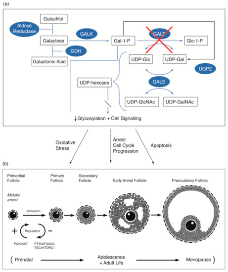 (a) Illustration of the pathways of galactose metabolism, with inhibition of the key enzyme: galactose-1-phosphate uridylytransferase. The key enzymes involved are shaded. (b) Illustration of the steps in oogenesis and folliculogenesis over the prenatal to menopause time period that may be influenced by GALT deficiency [16,17,18,19,20] with the proposed site of the PI3K/AKT regulation as cited by Sanchez and Smitz [20]. The abbreviations used are listed in the abbreviations list.