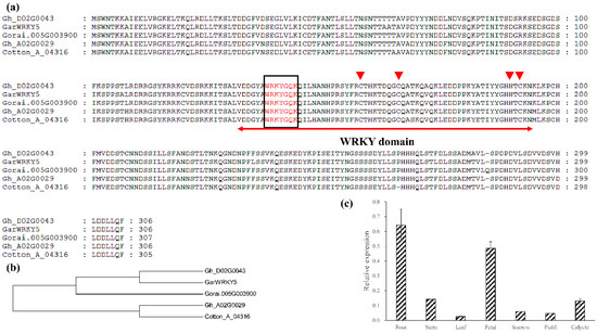 Structure, evolution, and expression of GarWRKY5. (a) Identification of the WRKY domain. The approximately 60-amino acid WRKY domain and C–X7–CX23–HXC-type zinc finger-like motif. The 60 amino acid WRKY domain was indicated by a red line and the conserved WRKYGQK sequence was black squares. The C and H residues of zinc finger domain were indicated by red triangles. (b) Phylogenetic analysis of GarWRKY5 between homologous genes from G. hirsutum (Gh_A02G0029/Gh_D02G0043), G. raimondii (Gorai.005G003900), and G. arboreum (Cotton_A_04316). (c) The expression of GarWRKY5 in different tissues and organs from G. aridum. The relative expression levels were calculated with three biological replicates and three experimental replicates. Standard deviation (SD) was used to calculate the error bars.