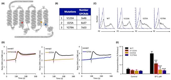 Effects of mutations at MRGPRX2’s highly conserved positions within transmembrane domains (V123A, I225A, and Y279A) on cell surface expression, SP-induced Ca2+ mobilization, and degranulation in transiently transfected RBL-2H3 cells. (A) Snake diagram of secondary structure of MRGPRX2. Each circle represents amino acid residue with one letter code. Solid red, yellow, and blue backgrounds denote the residues at positions 3x46 (V123), 6x37 (I225), and 7x53 (Y279), respectively; (B) amino acid change for each MRGPRX2 mutant.; (C) RBL-2H3 cells transiently expressing wild-type (WT)-MRGPRX2 and its mutants were incubated with phycoerythrin (PE)-anti-MRGPRX2 antibody and cell surface receptor expression was determined by flow cytometry. Representative histograms for WT/mutant (black line) and control untransfected cells (blue line) are shown; (D) cells expressing WT-MRGPRX2 and its mutants were loaded with Fura-2 and intracellular Ca2+ mobilization in response to SP (1 μM) was determined. Data shown are representative of three independent experiments; (E) cells were exposed to a buffer (control) or SP (1 μM) for 30 min, and β-hexosaminidase release was determined. All data points are the mean ± SEM of at least three experiments performed in triplicate. Statistical significance was determined by a nonparametric t-test. *** p ≤ 0.001 and **** p ≤ 0.0001.